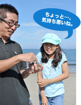 う〜む、でもね、魚はこのイソメが大好きなんだよ。ほら、頑張って自分で付けるんだよ。