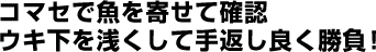 ![]() | コマセを使うのでサビキ釣りに似ていますが、こちらはハリが1本。1対1の真剣勝負が楽しめます。 ウミタナゴもサヨリも、コマセに良く反応するので、まずはポイントだと判断した場所にコマセを打ち、魚を確認しましょう。魚がいない場合は移動して、釣りを有利に進めることが大切です。 魚の姿をキャッチしたら、イラストのように、付けエサの位置でコマセが拡散するよう、潮の流れを考慮して潮上にコマセを打つ。徐々にタナを上げて手返し良く釣り続けましょう。 ![]() 玉ウキでもアタリは取れるが、ウミタナゴやサヨリのような繊細なアタリを待つ魚にはシモリウキをオススメです。 いくつかのシモリ玉を水面下に入れるこのウキは、ウキ同士の間隔の変化でアタリをいち早く教えてくれます。ウキがブレたり、浮上したら、すかさずアワセを入れて、効率良く仕留めましょう。 |